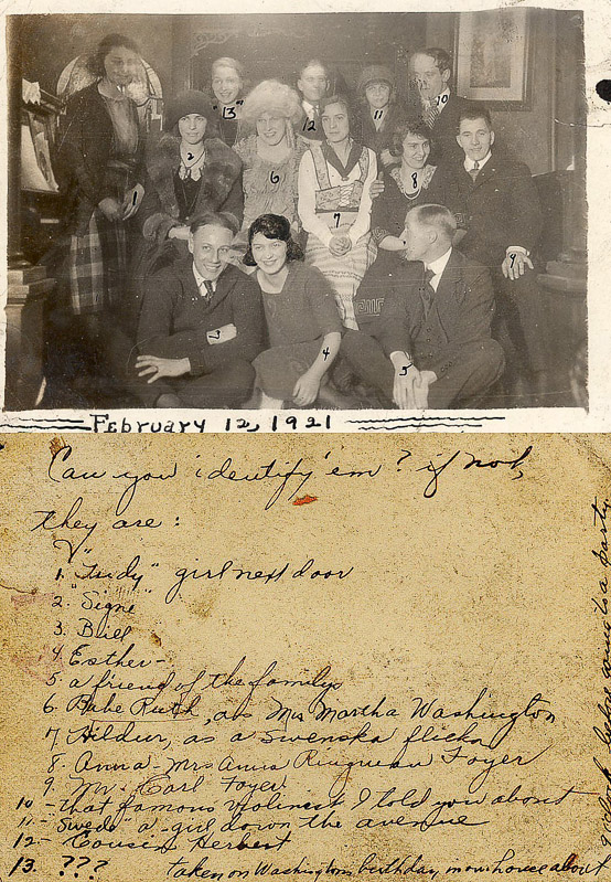An informal group photo of friends and neighbors, taken just before leaving for a party in 1921. I love group photos, and what an interesting moment was captured here. With this much personal information invested by someone so long ago, its easily one of my favorite photos in the entire collection.