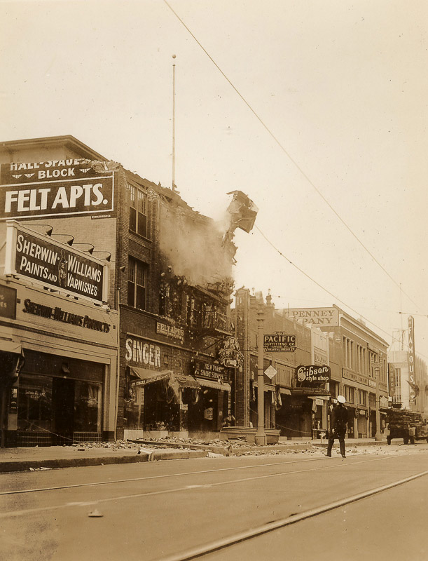 "Firemen demolish buidling on Pine Street Long Beach, CA"